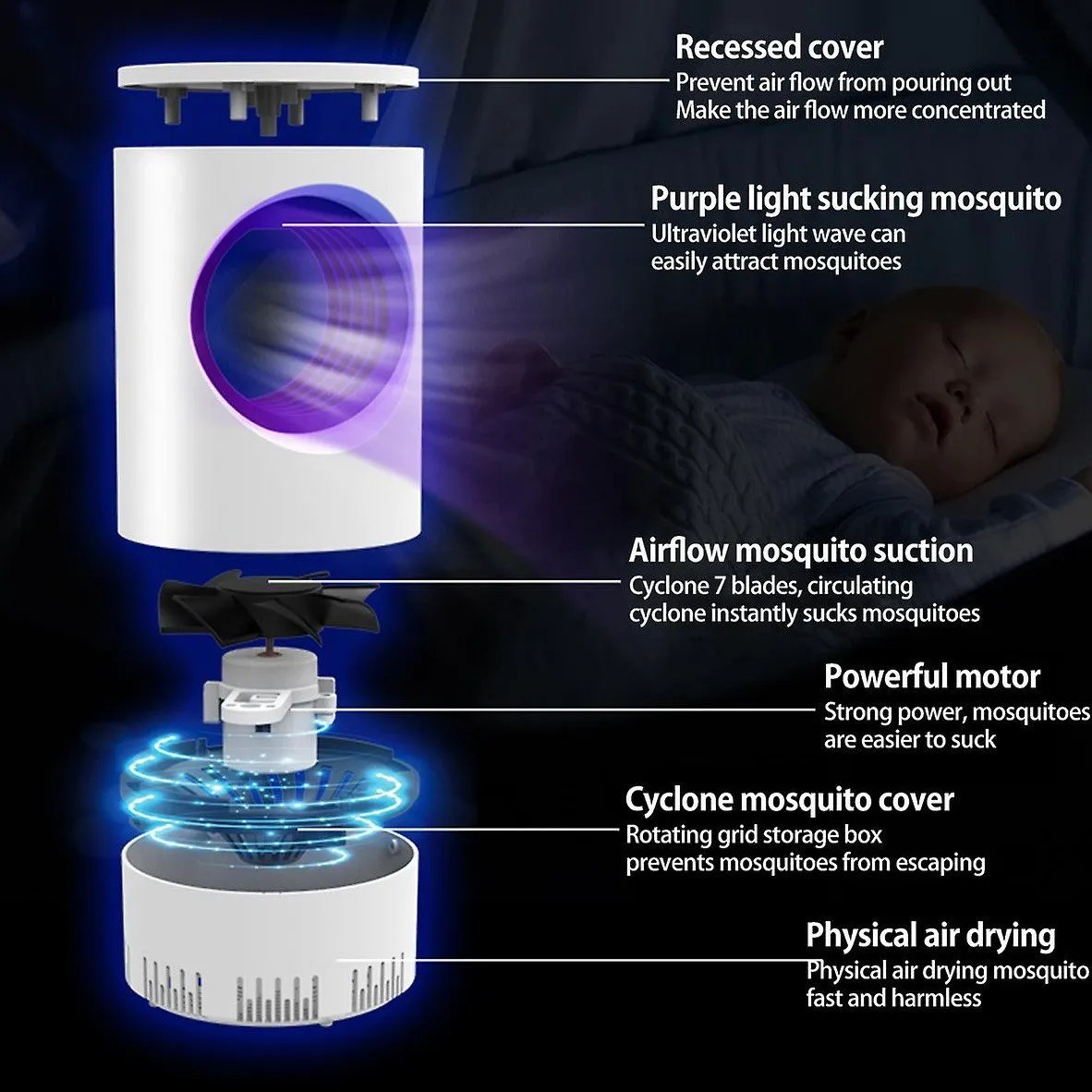 - Les mouches et les insectes sont attirés par la source de lumière, puis un puissant cyclone déshydratera et tuera le moustique.